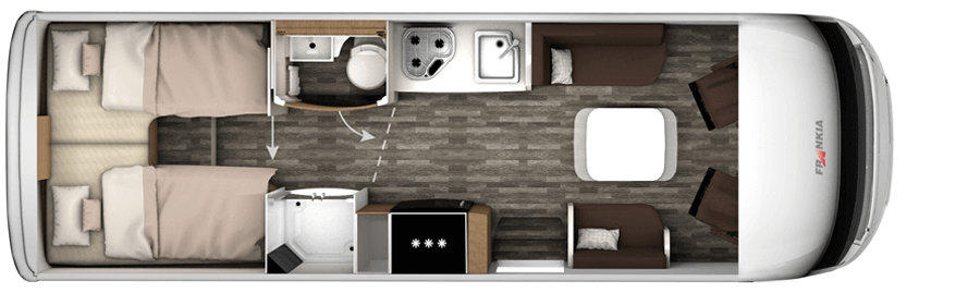 serienmäßigen FRANKIA Duo-Bett in der Front, das sich auf 2 x 2 m ausziehen lässt.